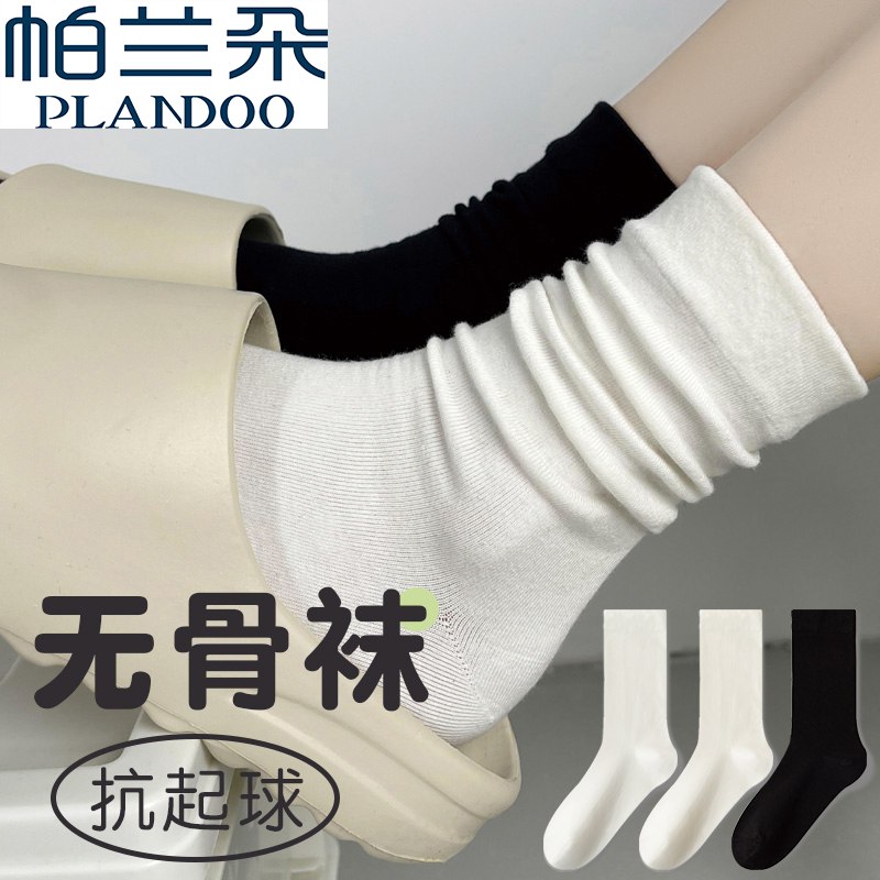 帕兰朵黑白色无骨袜子女秋季中筒新疆棉堆堆袜保暖长袜秋冬月子袜